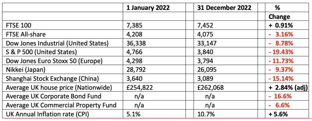 The effects of this were to make UK Stock markets (other than the FTSE 100) fall – significantly. The FTSE 250 (which is not on the table above) fell by 20% during 2022. The S&P 500 which covers the largest 500 companies in the United States, fell by a similar amount.